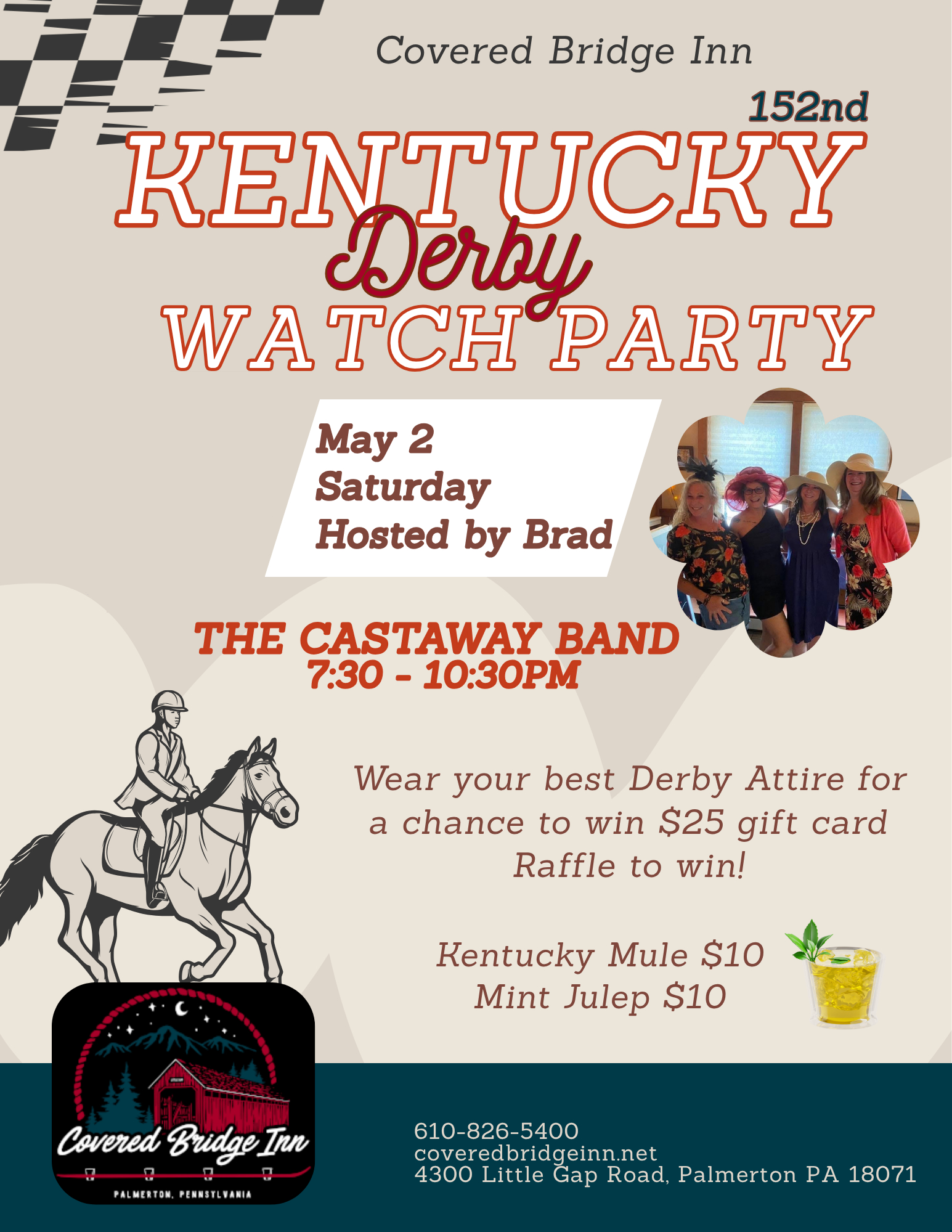 Home Home Kentucky Derby Watch Party Kentucky Derby Watch Party Join us for weekly live music & events in Palmerton PA at Covered Bridge Inn. + Add to Google Calendar + iCal / Outlook export Date May 02, 2026 Time 5:30 PM Share this event